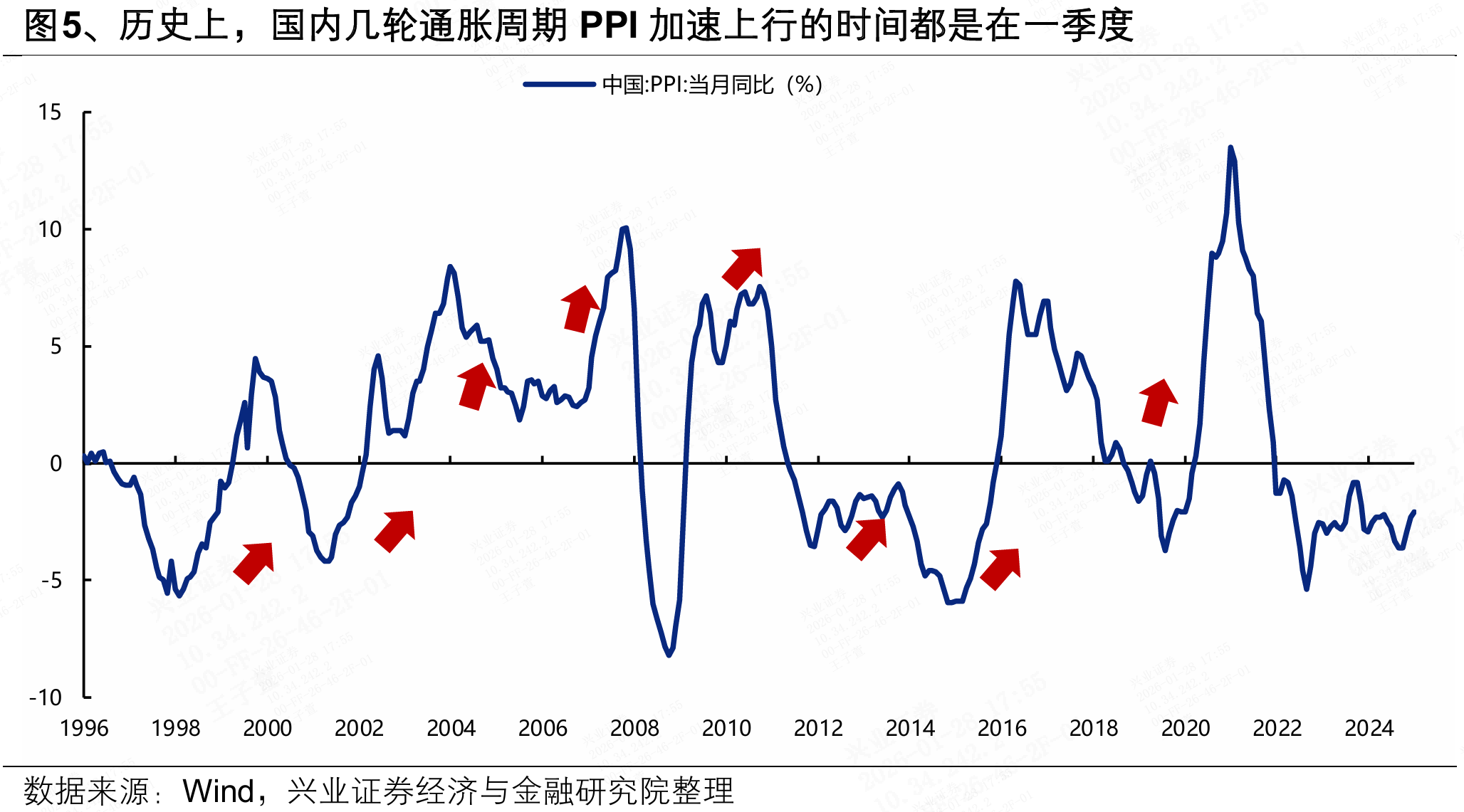 也因此,一季度有望是本轮PPI是否能够企稳上行的关键验证窗口。参考历史经验,国内几轮通胀周期PPI的加速上行的时间都是在一季度。