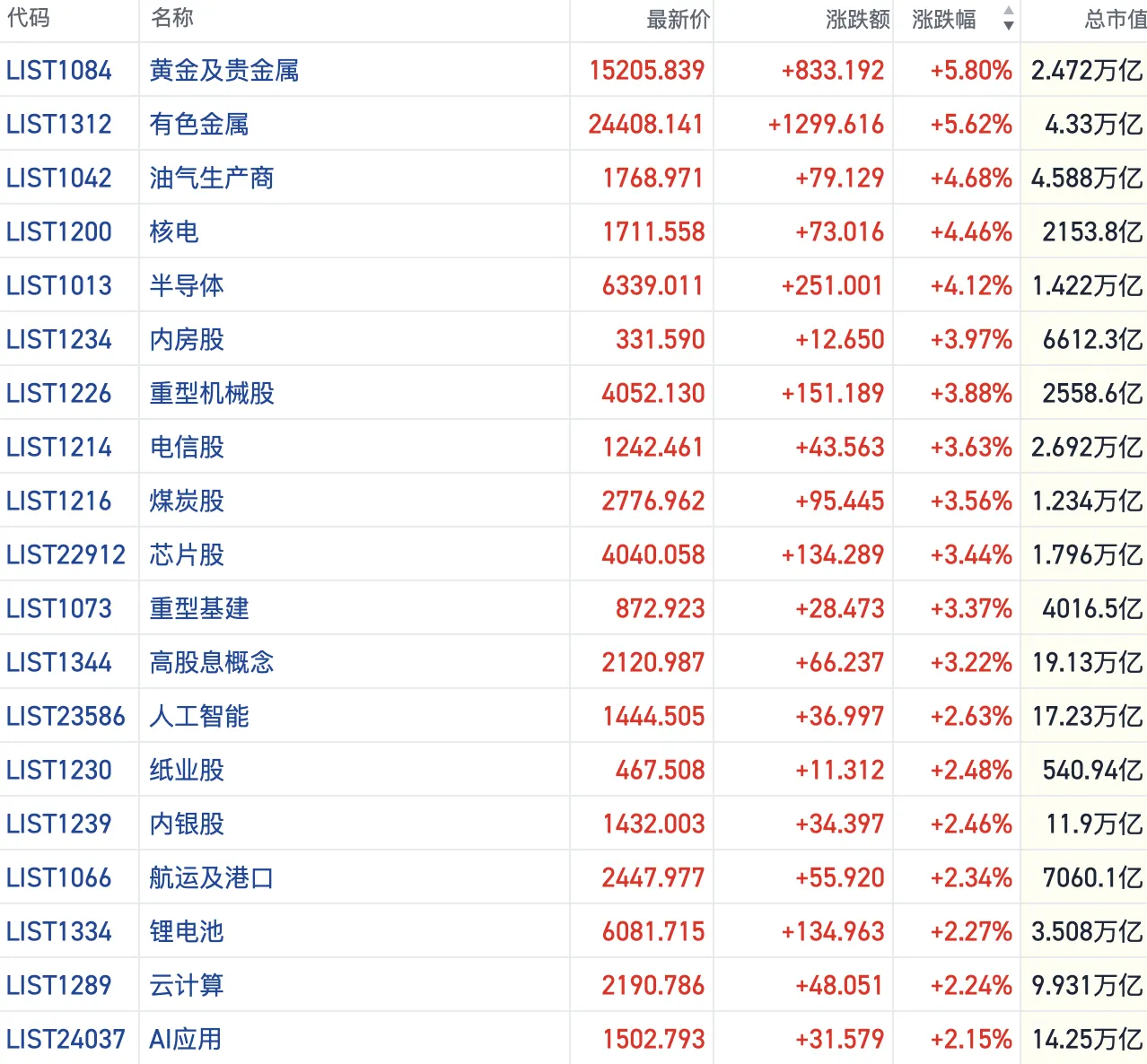 其他方向上,大金融及中字头等蓝筹板块也集体拉升。此外,黄金、有色板块继续强势,汽车、半导体、军工、地产等行业也集体上扬。