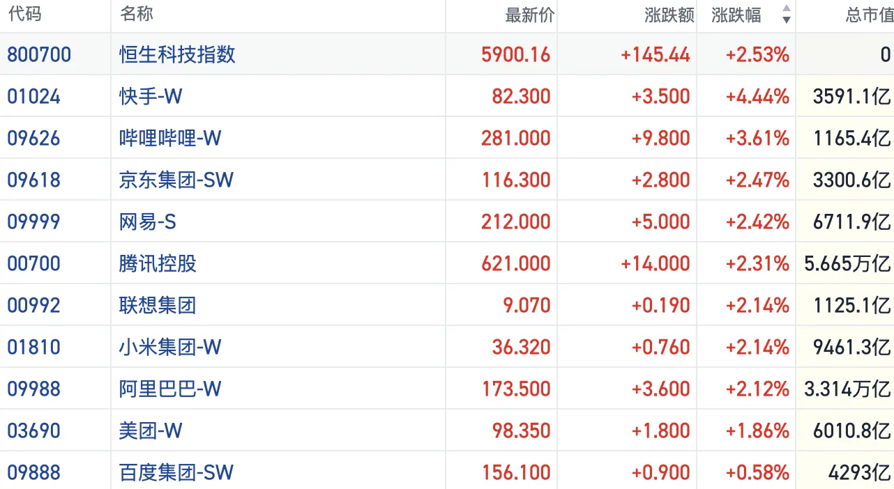 盘面上,今日大型科网股再度拉涨,快手涨超4%,京东、网易、腾讯、阿里巴巴、小米等均涨逾2%。