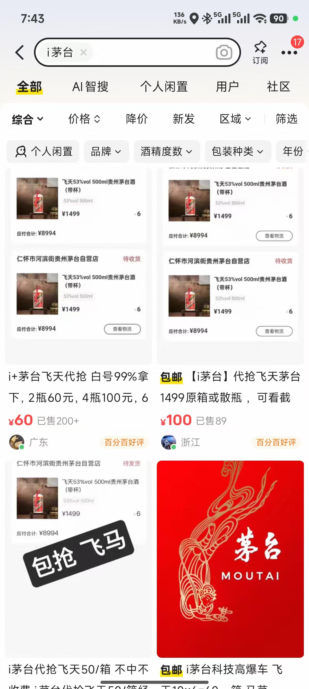 今年以来,飞天茅台批价一度跌破1499元/瓶,较官方售价倒挂,导致黄牛不愿在i茅台上抢平价茅台。而伴随飞天茅台批价上涨,飞天茅台、马年生肖茅台等热销产品的市场价与官方售价相比,价差空间拉大,催生了代抢服务的灰色产业链。财联社记者注意到,在某二手交易平台上,代抢平价茅台的服务报价在50-100元/单不等,部分黄牛甚至宣称“包中”,其核心竞争力在于使用专业的辅助软件和脚本工具。