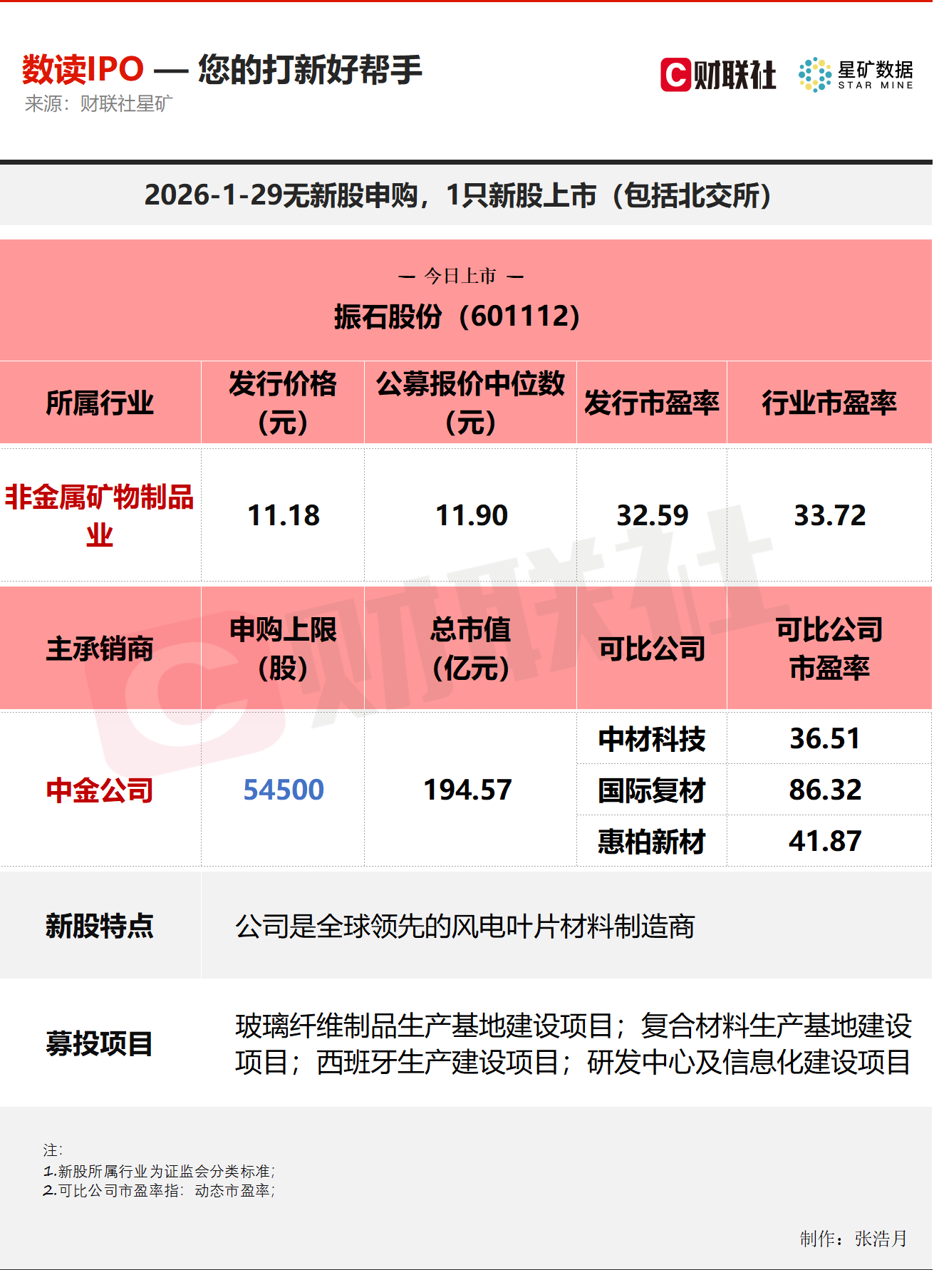 财联社1月29日讯,今日无新股申购;有1只新股上市,为沪市主板的振石股份。
