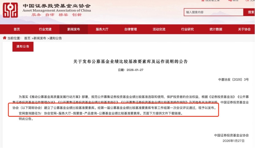 1月27日,中基协发布公告称,为落实公募基金高质量发展行动方案的部署,规范公开募集证券投资基金业绩比较基准选取和使用,依据业绩比较基准等相关规定,中基协建立了公募基金业绩比较基准要素库及运作说明,向基金公司发布。