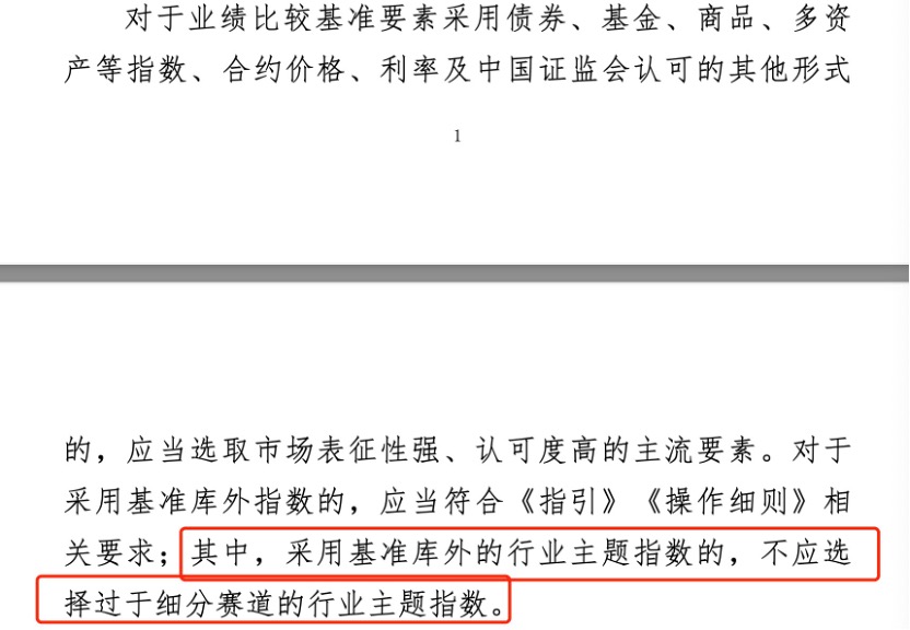 此外,《运作说明》对业绩比较基准要求采用债券、基金、商品、多资产等其他类型的,强调应选取市场表征性强、认可度高的主流要素或指数,而采用基准库外的行业主题指数的,不应选择过于细分赛道的行业主题指数。
