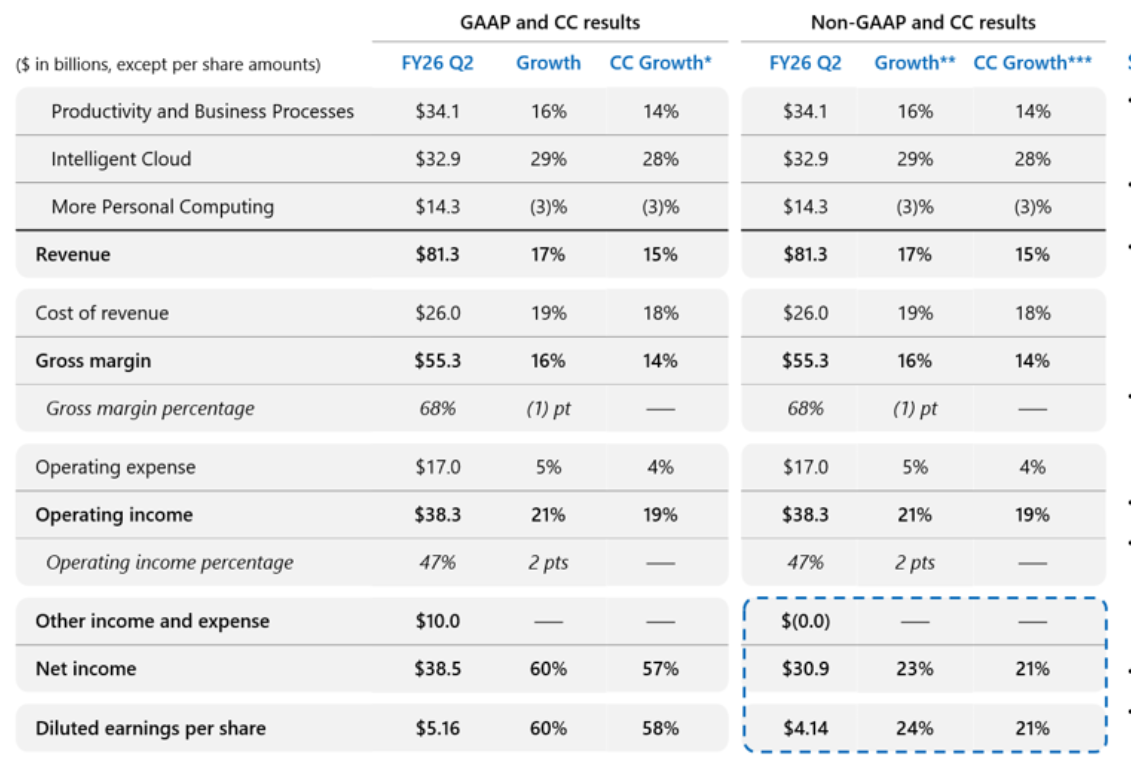 在本季度,微软表示将提高商业版Office办公软件订阅服务的价格,而AI独角兽公司Anthropic公司则宣布计划购买价值300亿美元的云服务,并从微软处额外购买多达10亿瓦的计算能力。