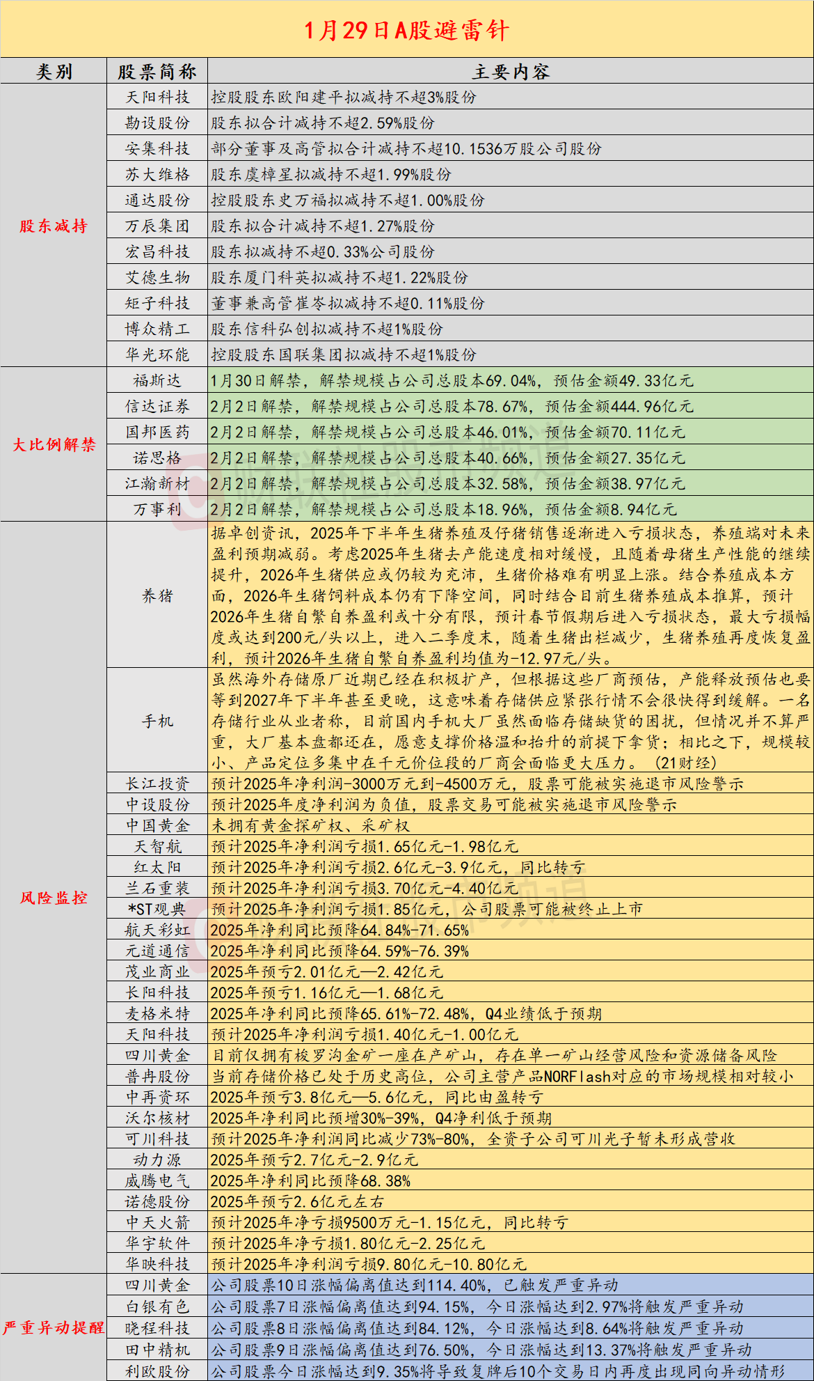 导读:财联社1月29日投资避雷针,近日,A股及海外市场潜在风险事件如下。国内经济信息方面包括:1)存储芯片涨价,千元手机紧急减产;2)机构预计2026年生猪养殖利润或十分有限;公司方面重点关注包括:1)长江投资预计2025年净利润-3000万元到-4500万元,股票可能被实施退市风险警示;2)4连板中国黄金公告,未拥有黄金探矿权、采矿权;海外市场重点关注包括:1)美股三大指数收盘涨跌不一,大型科技股走势分化;2)美国天然气期货跌幅一度扩大至15%。