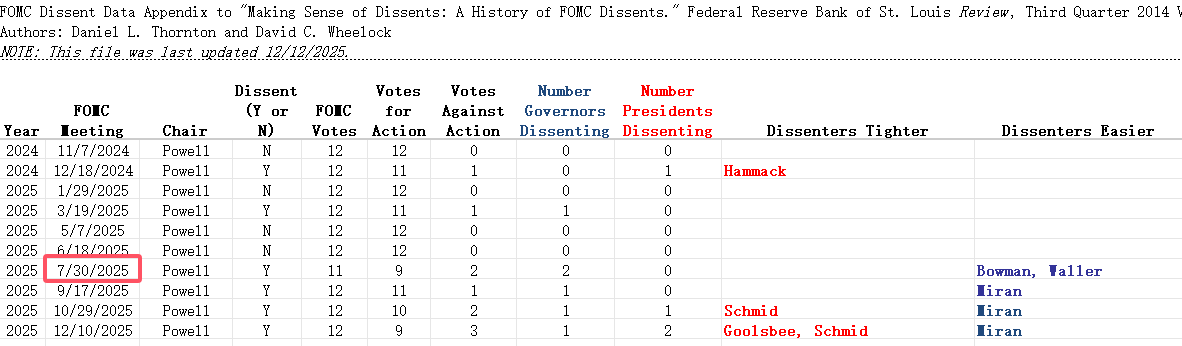 值得注意的是,美联储周三是以10比2的投票比支持维稳利率的。与沃勒一起投票支持降息的,只有外界几乎公认的特朗普“亲信”米兰,而另一位特朗普任命的美联储理事鲍曼,这一次则与多数派一起投票支持维持利率不变。