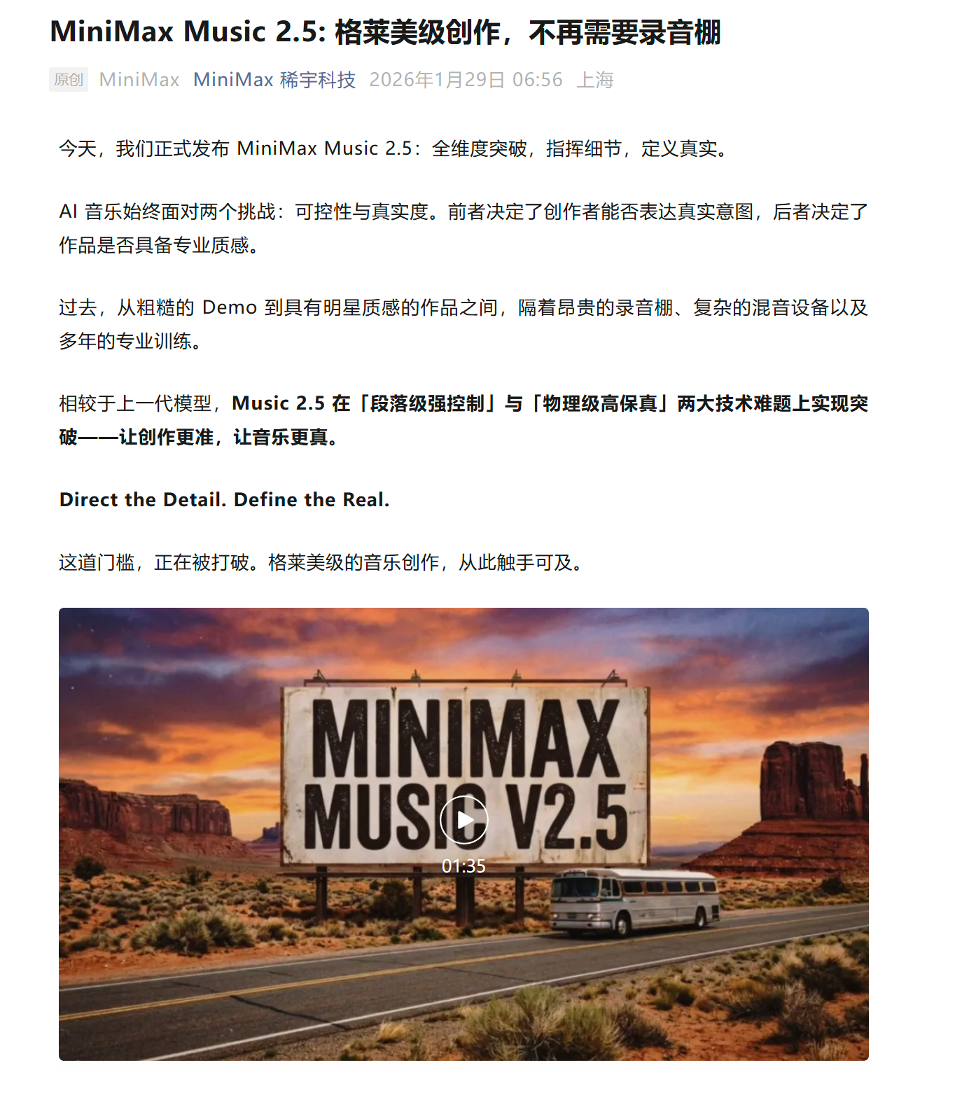 MiniMax今日正式推出Music 2.5音乐生成模型,在“段落级精准控制”与“物理级高保真还原”两大维度实现关键突破。该模型支持Intro、Bridge、Hook等14类音乐结构标签的全流程定制,创作者可预先设定情绪曲线、高潮节点与乐器编排逻辑,大幅降低试错成本。音质层面,通过人声合成算法优化,实现转音细腻度、颤音自然度及胸腔/头腔共鸣的灵活切换;在男女对唱场景中,声部协同与和声层次显著增强。