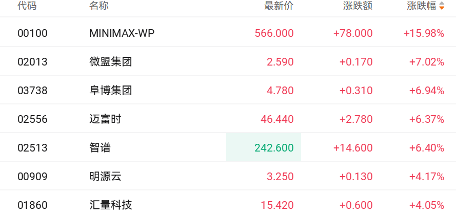 截至发稿,MINIMAX-WP(00100.HK)涨15.98%、微盟集团(02013.HK)涨7.02%、智谱(02513.HK)涨6.40%。