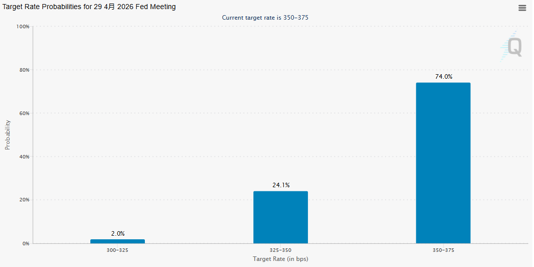 根据芝商所的美联储观察工具显示,美联储在4月会议(即鲍威尔任内最后一次会议)上降息的概率目前仅约为26%,按兵不动的概率则高达74%。