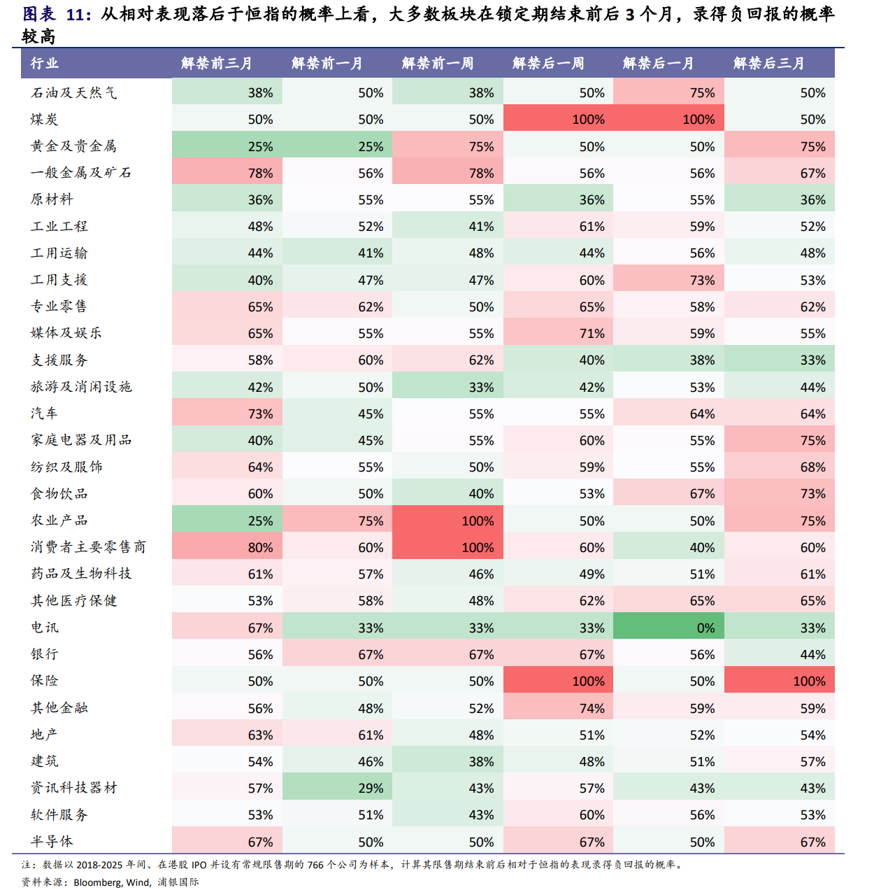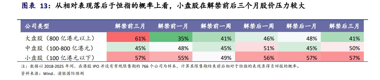 中盘股(市值100-800亿港元):受解禁影响相对温和,解禁前后各时段跑输恒指的概率约为45%-50%,且多数时段录得正回报。