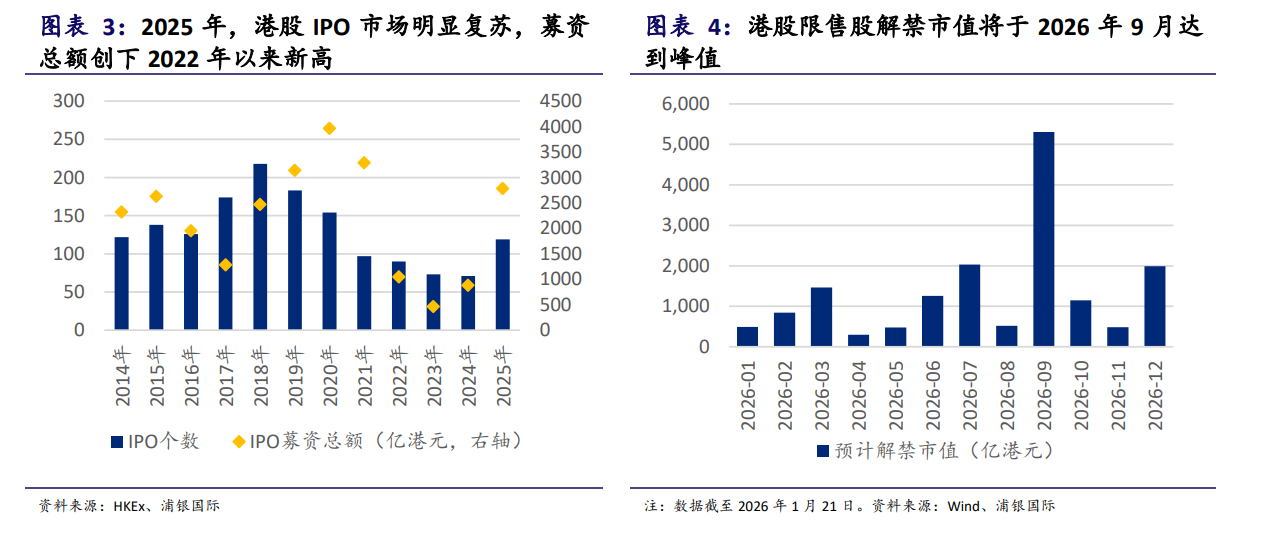 值得注意的是,港股核心成长板块(信息技术、可选消费和医疗健康)的解禁高峰集中出现在3-4月,这一时段的股份供给压力值得投资者重点关注。2025年港股IPO市场显著回暖,全年募资总额达2426.4亿港元(约312.2亿美元),跃居全球首位,为2026年的解禁潮奠定了基础。