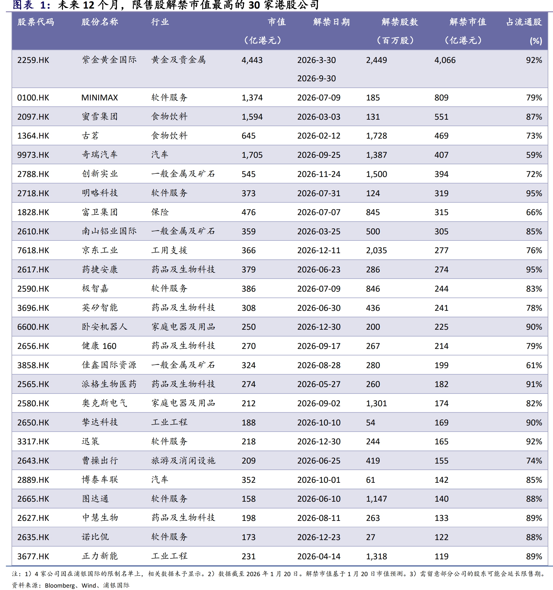 基于解禁市值维度,浦银国际筛选出未来12个月解禁规模最大的30家港股公司。其中,紫金黄金国际(02259.HK)以4066亿港元解禁市值居首,占其流通股比例高达92%;蜜雪集团(02097.HK)、MINIMAX(00100.HK)等消费与科技龙头解禁市值均超500亿港元。这些标的集中解禁可能对市场流动性及股价形成直接冲击。