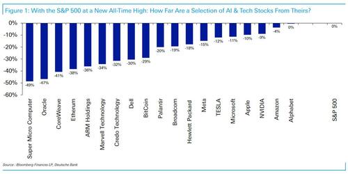 而科技股未来还能否重新引领市场,目前则依然是个未知数。德银发布的下图重点展示了一些科技股/AI概念股,以及它们目前股价与历史高点之间的差距——这些高点基本都是去年创下的,其中许多是在去年夏季之后创下的。考虑到时间跨度很短,一些股票的回落幅度可谓相当大,这也使得标普500指数目前展现出的韧性更加引人注目。