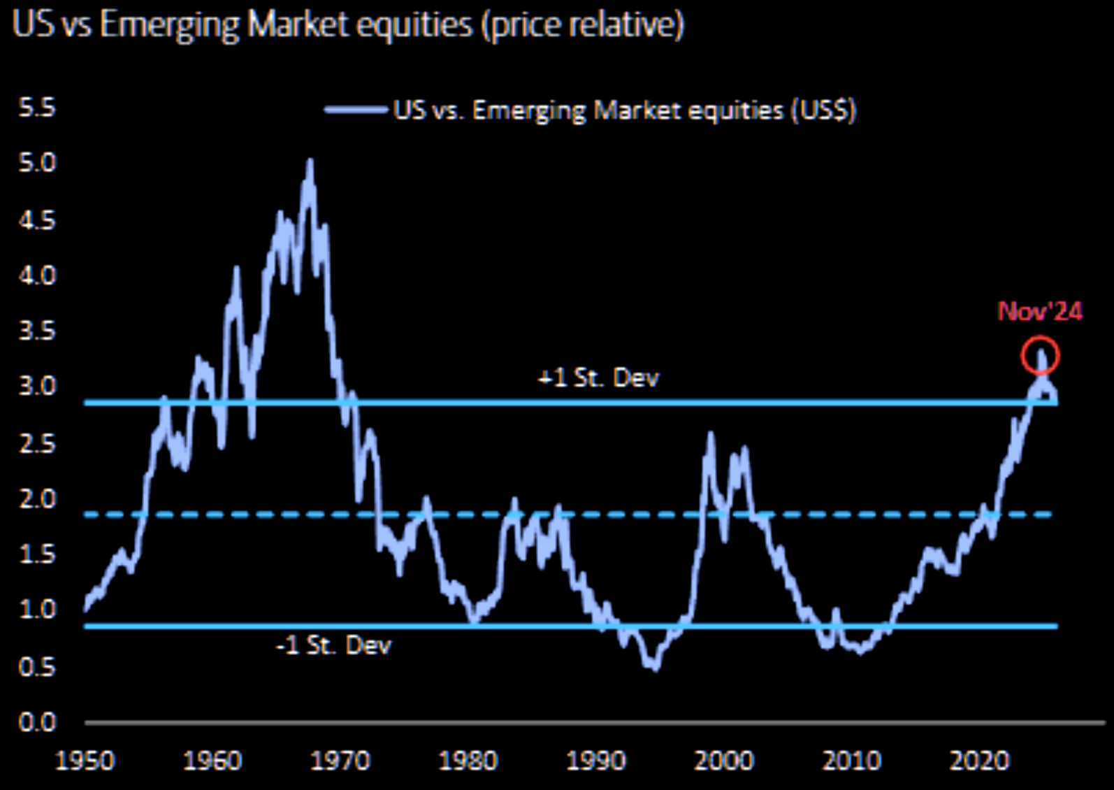 如下图所示,美国股市与新兴市场股市的强弱对比目前正发生着微妙逆转……