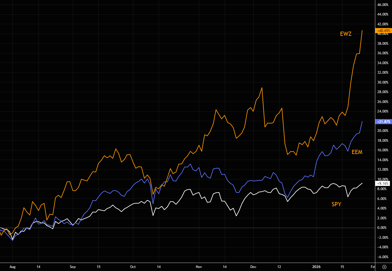 近几个月来华尔街反复出现的主题是:与其盯着美股“昏昏欲睡”的走势,不如去外面看看更令人兴奋的地方。这六个月的表现说明了一切:巴西股市ETF(EWZ)上涨了41%,新兴市场ETF(EEM)上涨了22%,而标普500ETF(SPY)仅上涨了9%。”