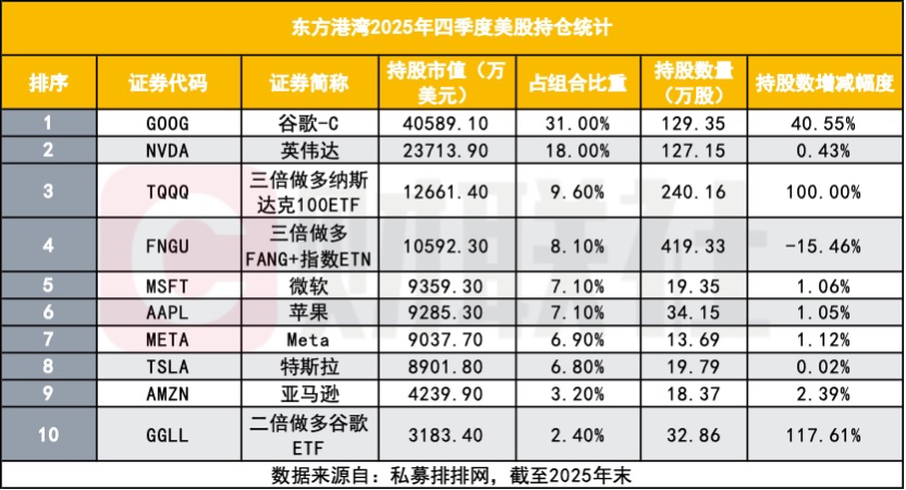 如果进一步拆解持股数量与变动,可以更直观地看到“谷歌上位”的路径。四季度内,东方港湾将谷歌的持股数量提升到129.35万股,增幅达到约40.55%。在股价当季上涨近29%的配合下,谷歌市值快速抬升,直接完成了对英伟达仓位的反超。相比之下,英伟达持股数量为127.15万股,增幅仅0.43%,非强力加码。
