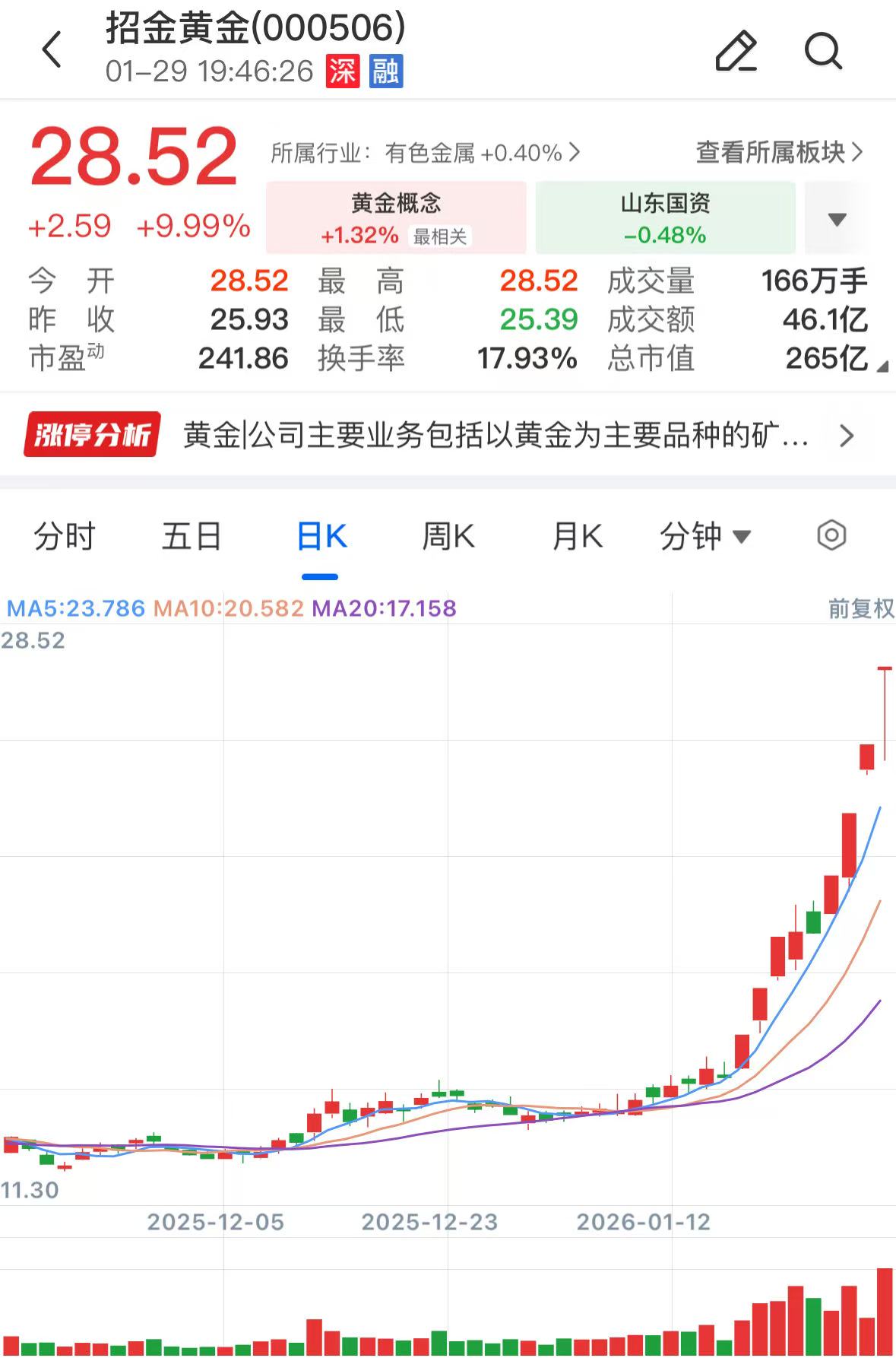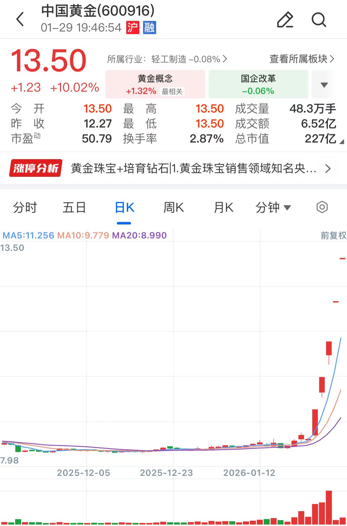 中国黄金发布公告称,公司股票于2026年1月23日、1月26日连续两个交易日以涨停价收盘。公司主营业务未发生变化,主要从事黄金珠宝首饰研发、加工、零售、批发及回购等,未拥有探矿权、采矿权。截至2026年1月29日,公司市盈率为55.63倍,公司所处行业市盈率中位数为28.60倍,公司相关指标明显高于行业平均水平。公司股票交易存在市场情绪过热情形,可能存在短期涨幅较大后的下跌风险。