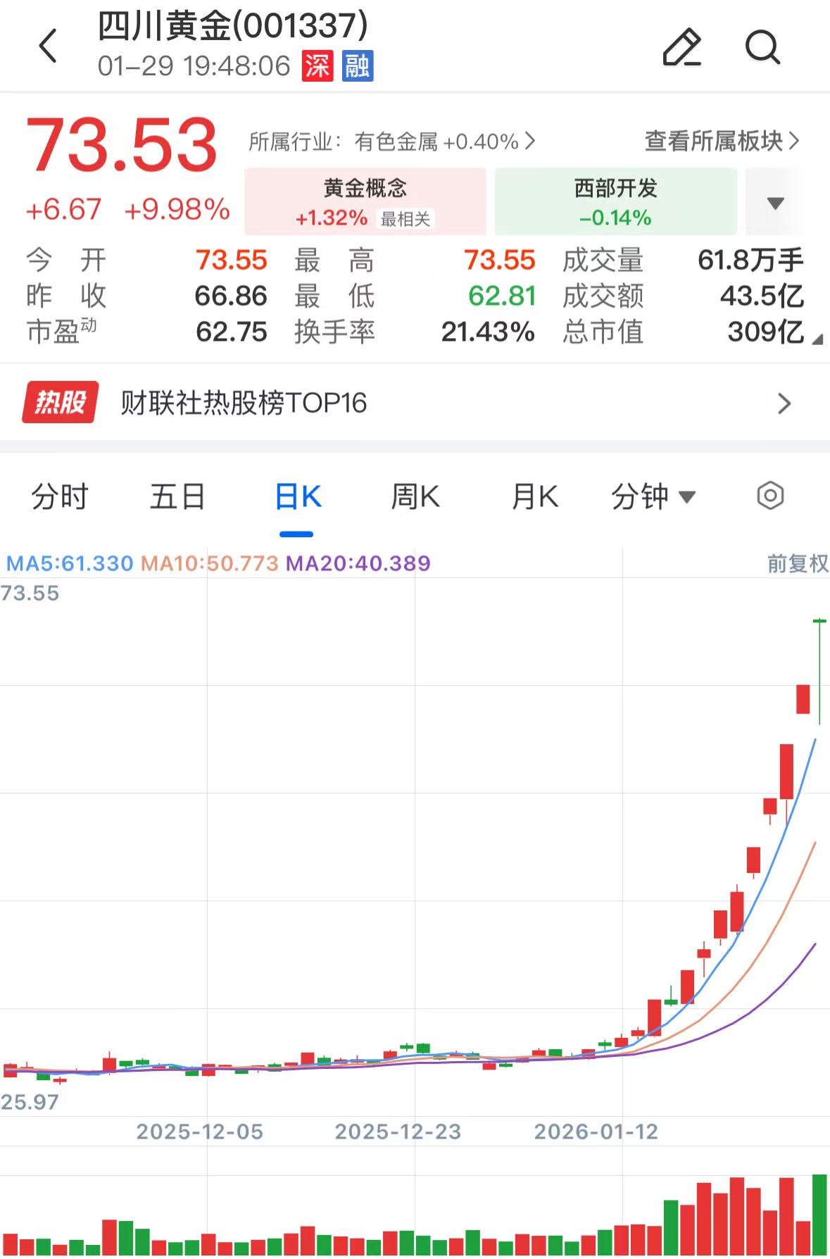 此外,四川黄金今日发布业绩预告,预计2025年归属于上市公司股东的净利润为4.2亿元-4.8亿元,比上年同期增长69.23%-93.40%。2025年度,公司继续保持稳健经营,预计归属于上市公司股东的净利润同比上升主要系金精矿销售量同比有所增加及黄金价格上涨所致。