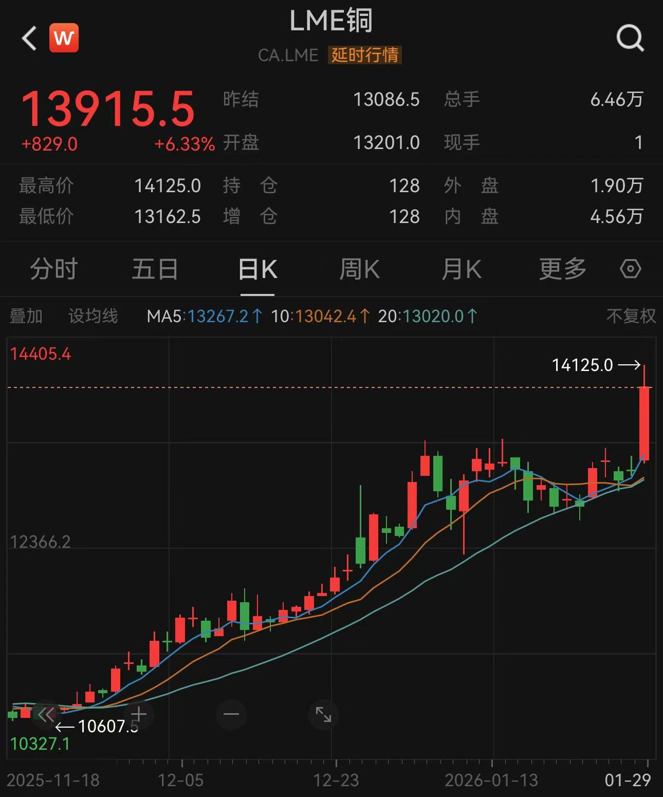 截至发稿,经历午后亚盘时段的强劲拉升后,伦铜涨幅维持在6%上方,日内历史首次突破14000万美元/吨。现货黄金一度迫近每盎司5600美元关口,现货白银日内也曾历史首次摸到120美元。