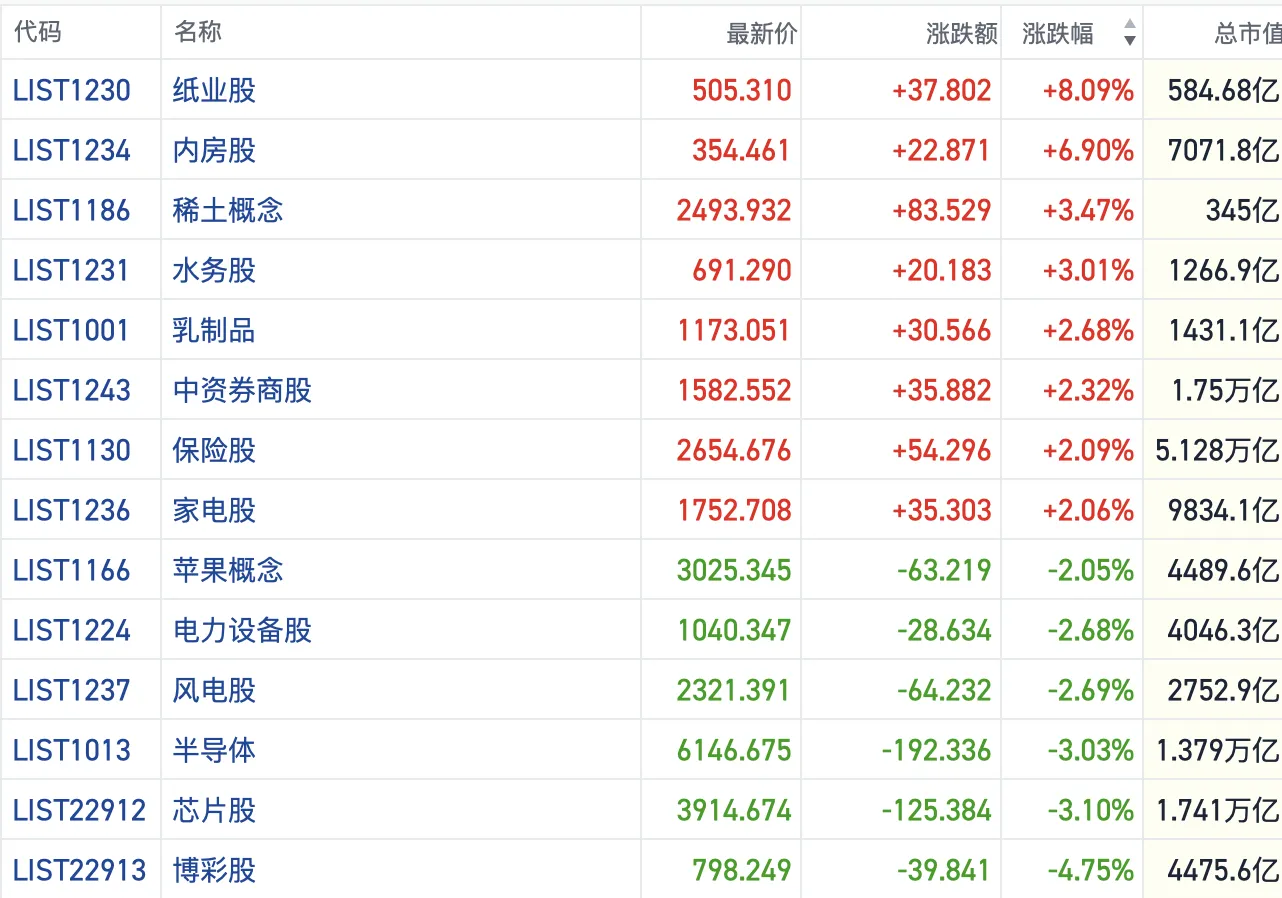 其他方向上,地产股受利好催化大幅拉升,AI应用概念再度走强。此外,保险、航运、纸业,及家电、白酒等消费股表现活跃。