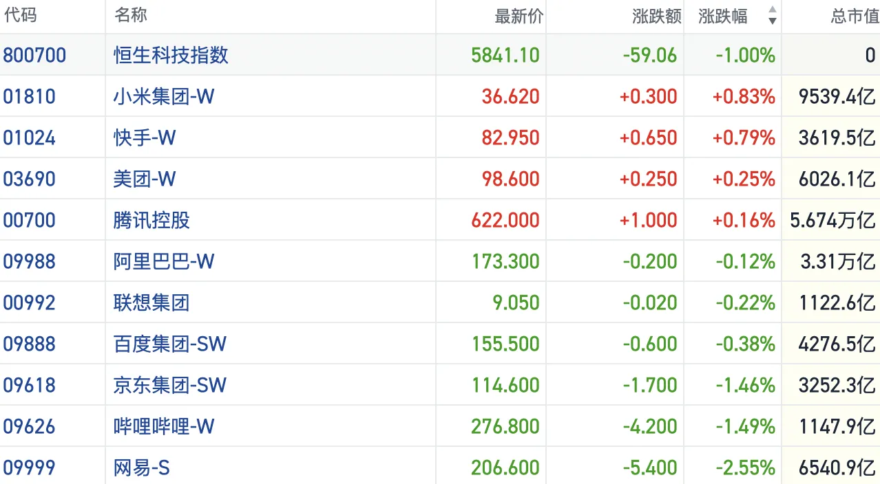盘面上,今日大型科网股涨跌不一,小米涨约1%,美团、腾讯勉强飘红,京东跌1.46%,百度、阿里巴巴小幅下跌。