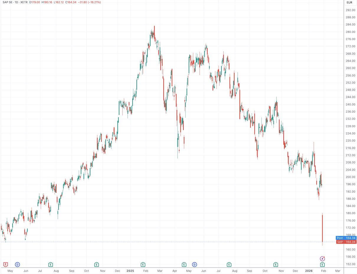 令公司股价雪上加霜的是,SAP不仅是“AI叙事”的成员,也是“AI受害者”——软件公司阵营的一线巨头。