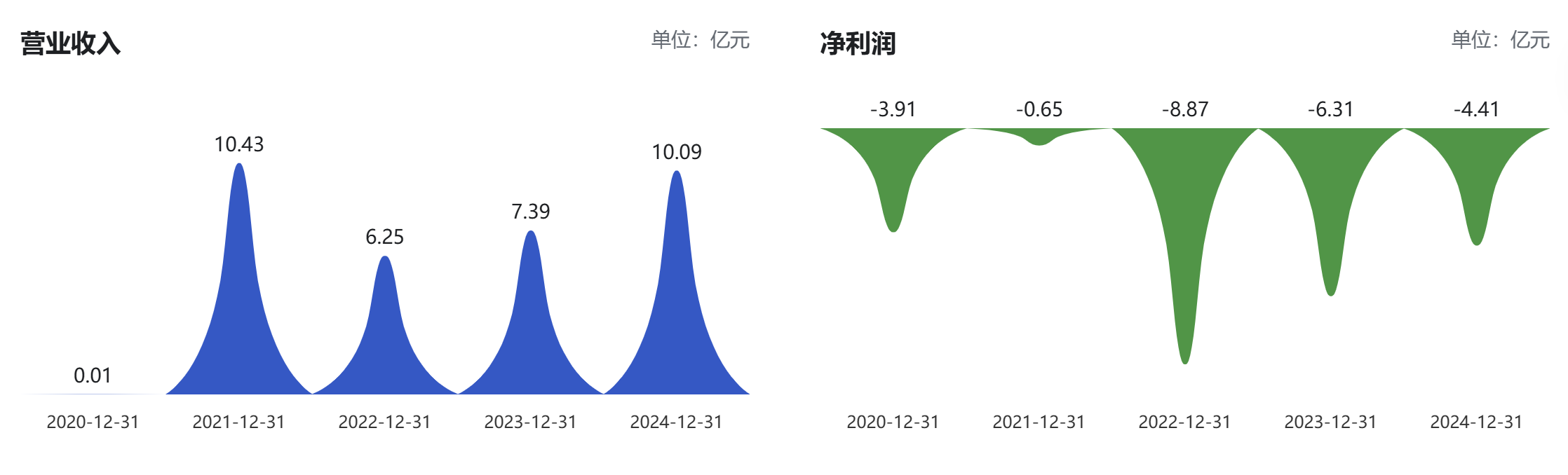 据诺诚健华此前的财报数据显示,2020年-2024年,其分别实现营收0.01亿元、10.43亿元、6.25亿元、7.39亿元、10.09亿元,净利润分别为-3.91亿元、-0.65亿元、-8.87亿元、-6.31亿元、-4.41亿元。
