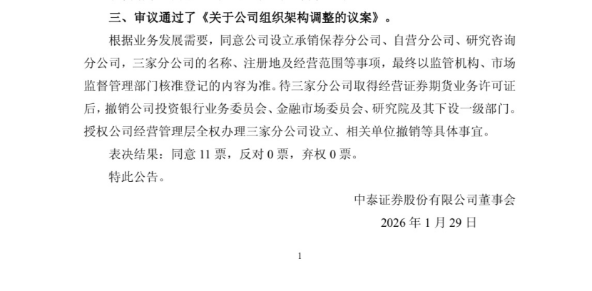 对于中泰证券而言,本次架构调整的落地效果,取决于过渡衔接与后续运营机制的完善。公告明确,三家分公司的设立需经监管机构与市场监督管理部门核准,且需取得经营证券期货业务许可证后,方可撤销原有委员会及下设部门,这一安排为业务平稳过渡预留了时间窗口。