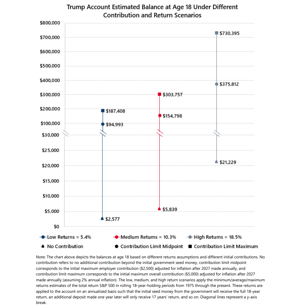 与此同时,那些按政策上限储蓄“特朗普账户”的孩子,到18岁时在同样三种情境下的账户余额将达到18万、30万和73万美元。