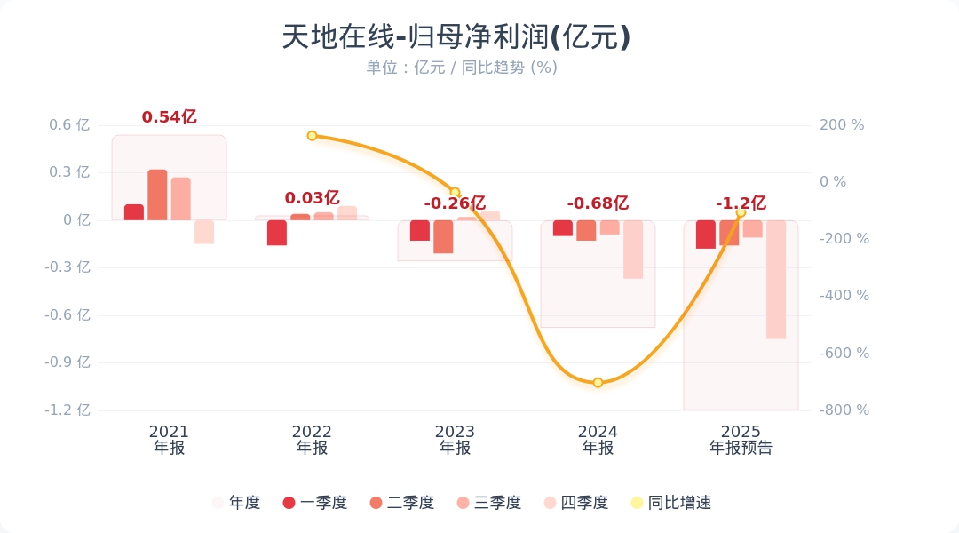 财联社1月30日电,天地在线(002995.SZ)公告称,预计2025年度归属于上市公司股东的净利润为-15,300万元至-8,600万元。上年同期归属于上市公司股东的净利润为-6754.39万元。报告期内,受上游媒体政策影响,公司采购成本有所上升,导致公司整体经营业绩有所下降;同时,公司对报告期末各类资产进行全面清查,基于谨慎性原则,公司对存在减值迹象的相关资产计提资产减值准备,导致本年度计提金额较上年同期有所上升。小财注:天地在线2025年Q3净利-0.11亿元,据此计算,2025年Q4净利预计亏损0.42亿元-亏损1.09亿元。