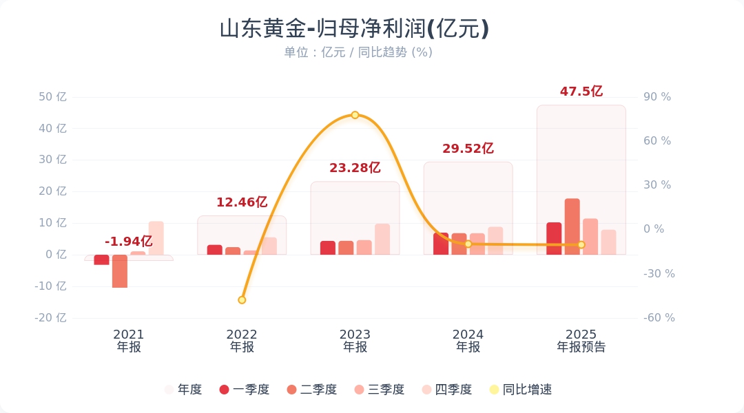 财联社1月30日电,山东黄金(600547.SH)公告称,预计2025年度归属于上市公司股东的净利润为46亿元至49亿元,同比增加56%到66%。业绩增长主要系公司优化生产布局、提升资源利用与项目建设协同效率,并受益于黄金价格上行;同时加大井巷开拓、深部探矿、智能化投入及采掘自营转化,推动盈利提升。小财注:Q3净利润11.48亿,据此计算,Q4净利润预计6.44亿-9.44亿,环比变动-43%至-17%。