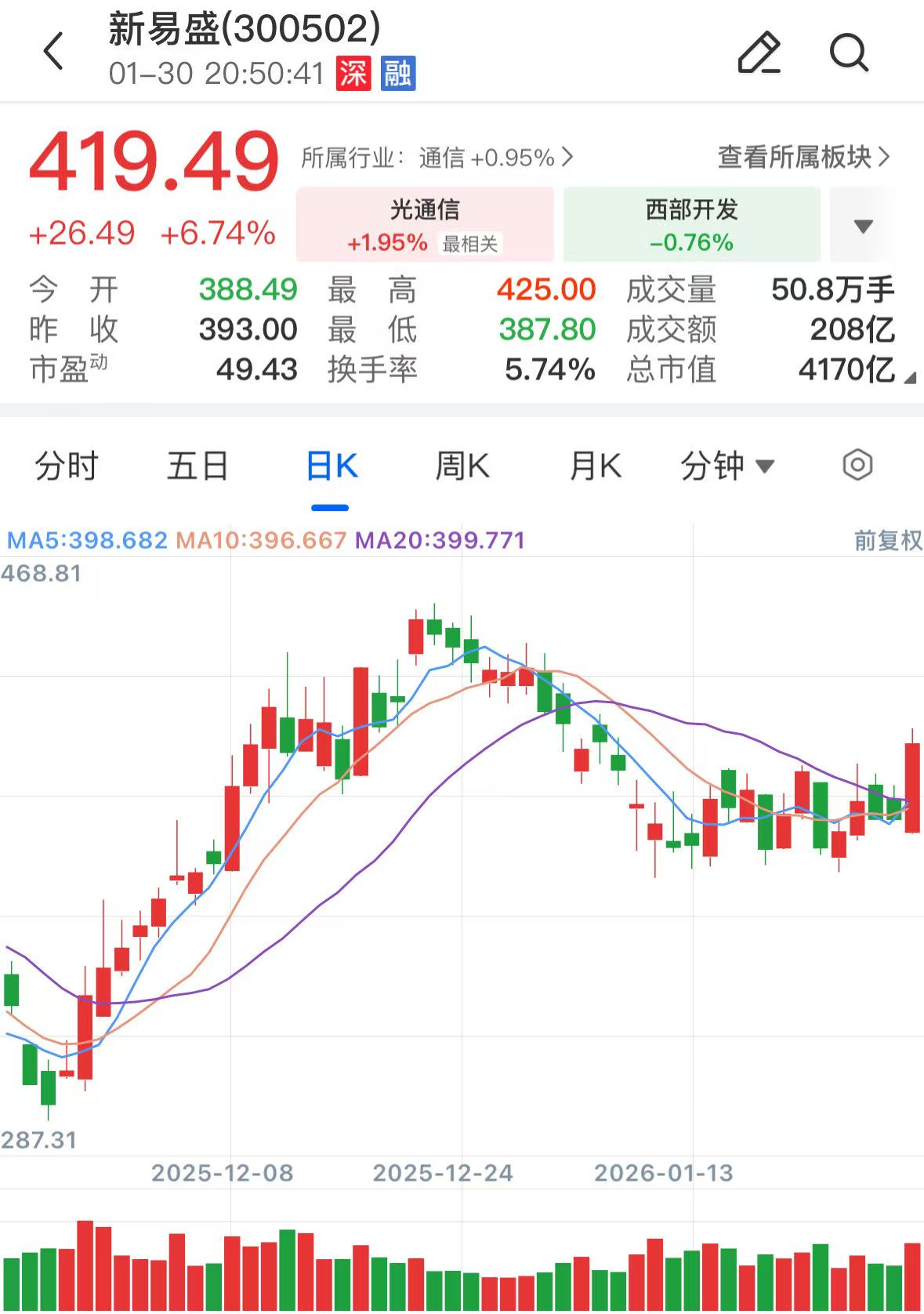 股价表现方面,新易盛去年累计涨幅达423.93%,1月份股价小幅收跌,该股今日股价报收419.49元/股,总市值4170亿元。