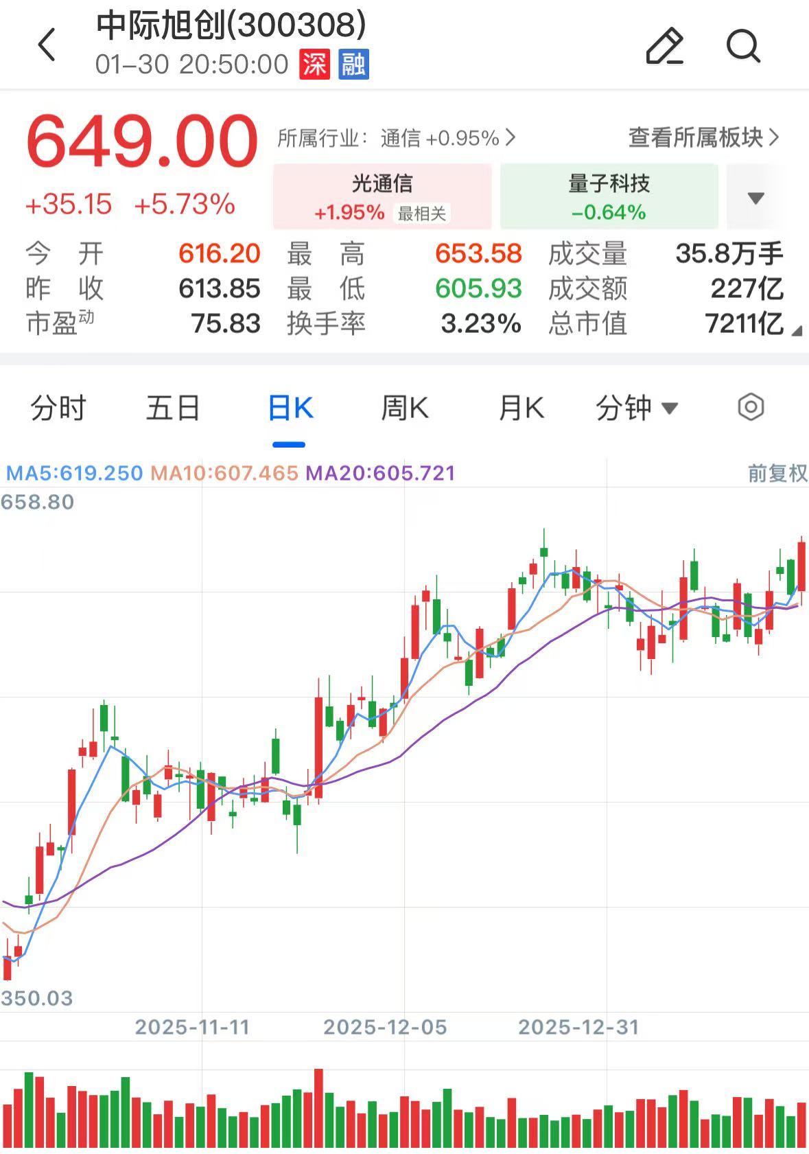 股价表现方面,中际旭创去年累计涨幅达397.5%,今年涨势延续。该股今日股价报收649元/股,总市值7211亿元。