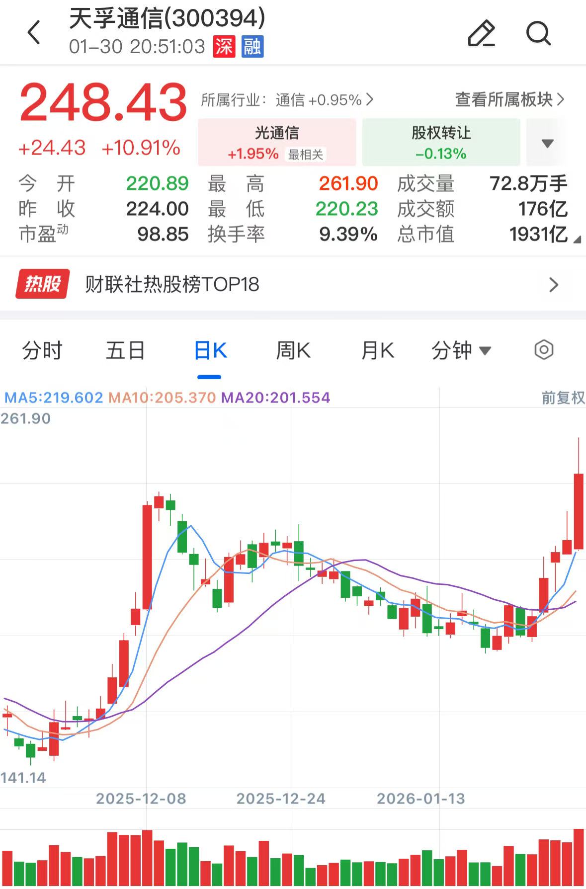 股价表现方面,天孚通信去年累计涨幅达215.3%,今年股价涨势延续,1月涨超20%。该股今日股价报收248.43元/股,总市值1931亿元。