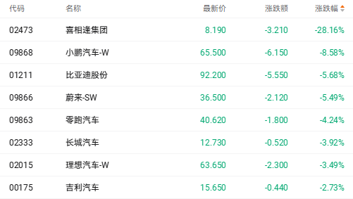 财联社2月2日讯(编辑 胡家荣)港股新能源汽车板块普遍走弱。截至发稿,小鹏汽车-W(09868.HK)跌8.58%、比亚迪股份(01211.HK)跌5.68%、蔚来-SW(09866.HK)跌5.49%、零跑汽车(09863.HK)跌4.24%。