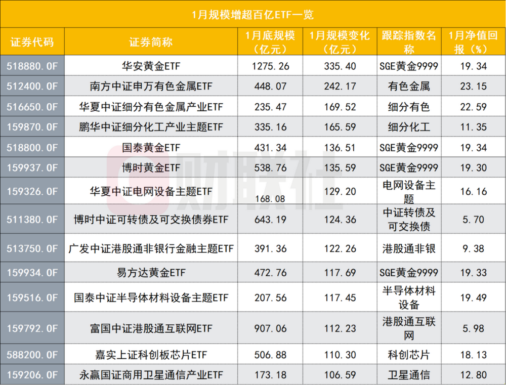 新增了1只千亿级和1只500亿级别ETF,黄金主题ETF也是1月规模增长最多的。数据显示,黄金主题ETF合计在1月规模增长820.73亿元,至3009.63亿元。除了前述2只黄金主题ETF,国泰基金和华夏基金旗下的黄金主题ETF也在1月规模增超百亿元。