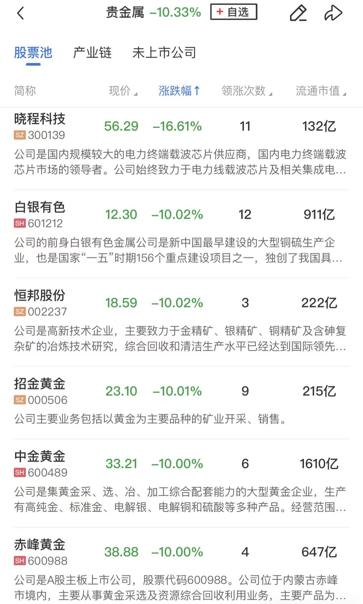 贵金属集体重挫,中国黄金、招金黄金、白银有色、中金黄金、兴业银锡、赤峰黄金、西部黄金等个股跌停。
