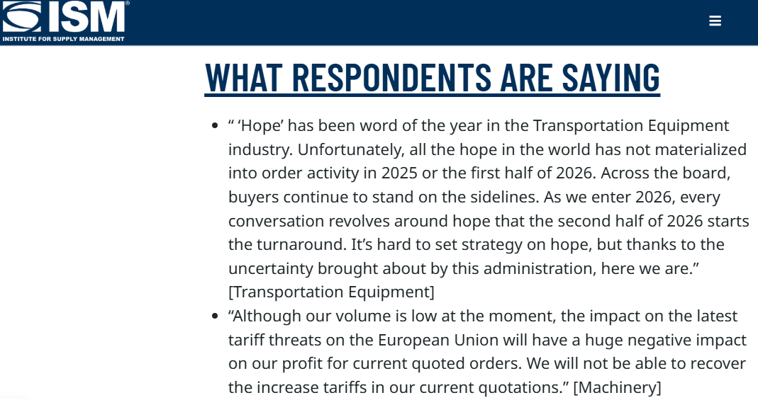 Spence说的“相关评论”,指的是PMI报告中摘选出的“受访企业高管的原话摘要”(WHAT RESPONDENTS ARE SAYING),而最新报告中的摘要,几乎全是美国各行各业对美国关税和政策不确定性的抱怨。