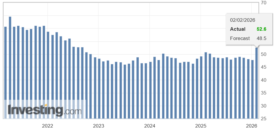 财联社2月3日讯(编辑 史正丞)根据供应管理协会(ISM)周一公布的数据,美国1月制造业采购经理人指数(PMI)意外从上个月的47.9升至52.6,近一年来首次进入扩张区间,也是自2022年2月以来的最高值。