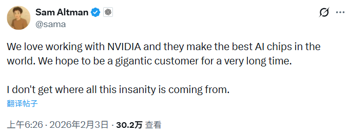 对此,OpenAI首席执行官奥尔特曼迅速发帖,称喜欢与英伟达合作,并称“不知道这一切疯狂从何而来”。