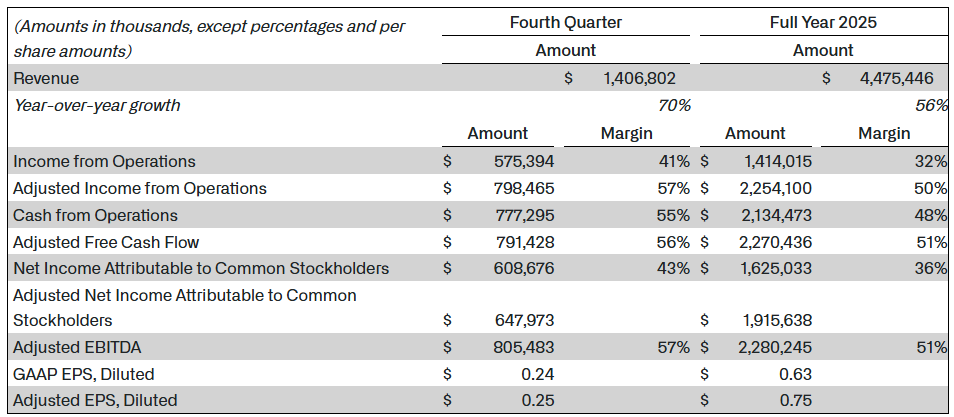 这一业绩也帮助Palantir在2025年全年营收同比增长56%,美国市场营收同比增长75%至33.2亿美元,全年净利润为16.25亿美元。