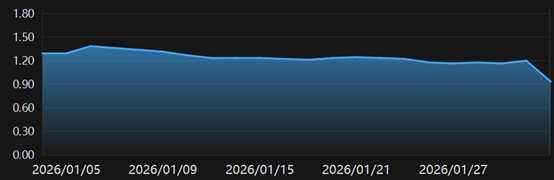 根据华西证券宏观固收团队的统计,今年1月票据利率持续位于较低水平。2023-2025年,1M票据利率在1月末五日的均值在2.48-2.72%,显著高于2.04%-2.39%的全月均值。然而,今年1月1M票据利率在月末周的均值为1.74%,仅较全月均值高10bp;3M和6M则均转为下行,月末周均值分别较全月平均低3、7bp。