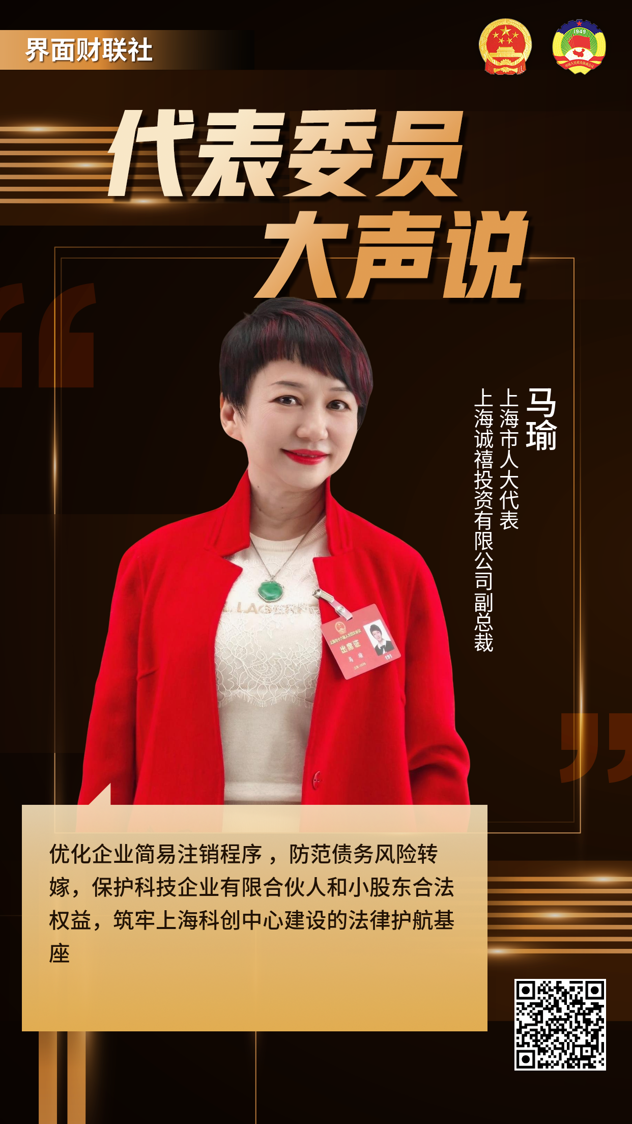 《科创板日报》2月3日讯(记者 张洋洋)在正在举行的上海两会上,上海市人大代表、上海诚禧投资有限公司副总裁马瑜带来了多分提案,其中一份是《关于关于“优化企业简易注销程序 ,防范债务风险转嫁,保护科技企业有限合伙人和小股东合法权益,筑牢上海科创中心建设的法律护航基座”》的建议。