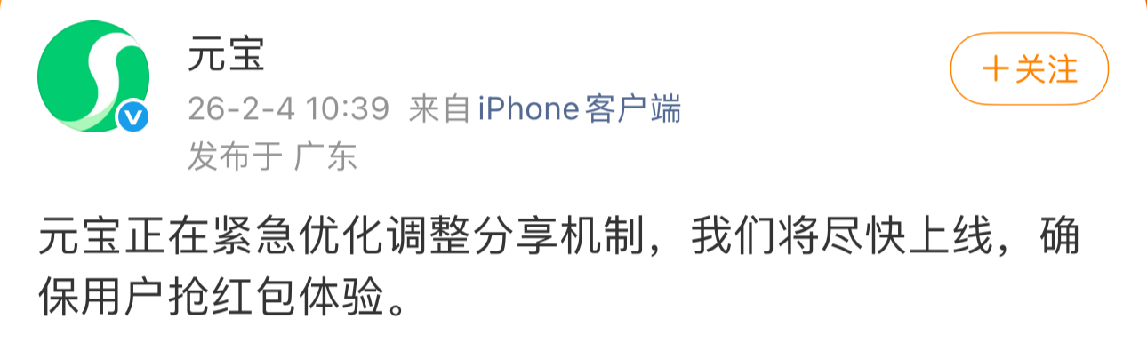 针对微信平台的处置,元宝官方同样也在微博迅速称,元宝正在紧急优化调整分享机制,将尽快上线,确保用户抢红包体验。