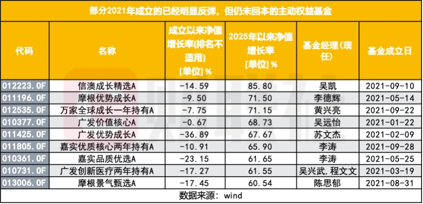 更微妙的是,还有一大批产品处在“已经明显反弹,但仍未回本”的灰色地带。统计显示,在成立以来收益仍为负的基金中,不乏今年以来涨幅非常可观的产品。例如,信澳成长精选2025年以来涨幅已经接近86%,但成立以来仍小幅亏损;摩根优势成长、万家全球成长一年持有等产品今年以来涨幅也在70%左右,却仍未完全抚平过去几年的回撤;广发优势成长今年以来收益超过60%,成立以来却依旧亏损三成以上。