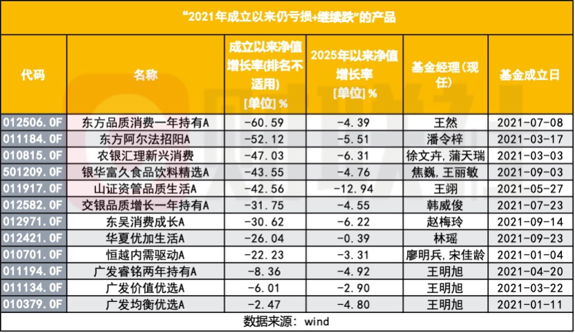 从数据上也能印证这一点。在回撤最深的前十只产品中,绝大多数都聚焦于消费、医药或内需成长领域;而此前提到的几只同时满足“累计回撤40%以上+2025年以来仍为负收益”的基金,同样以这些赛道为主。