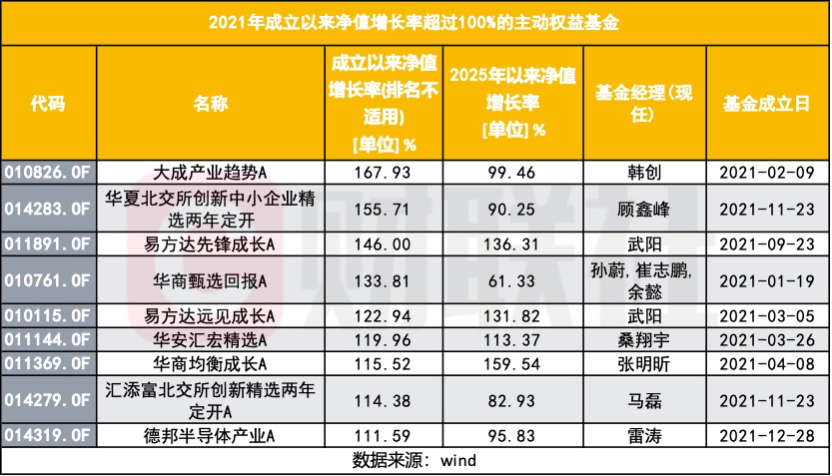 当然,2021年并不是“所有新基都失败”的时间点。同一批产品中,也有不少基金已经走出了完全不同的收益曲线。统计显示,自成立以来收益超过50%的产品共有56只,其中表现最亮眼的,大成产业趋势成立以来涨幅接近1.7倍,易方达先锋成长、易方达远见成长、华商甄选回报等产品自成立以来涨幅均在一倍左右,并且2025年以来的收益仍维持高位。