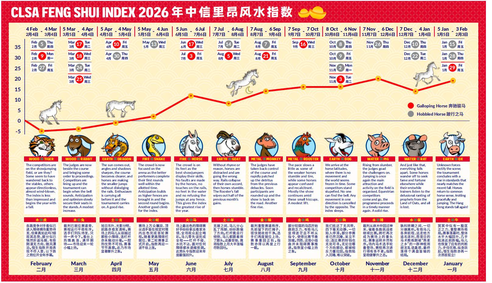 中信里昂在去年的风水指数报告中特别注明,中信里昂证券的《风水指南》于1992年以农历新年贺卡的形式首次亮相,旨在以轻松的方式展望香港市场,这已经成为该公司广受欢迎的传统。但需要明确的是,该指南并非严肃的研究报告。