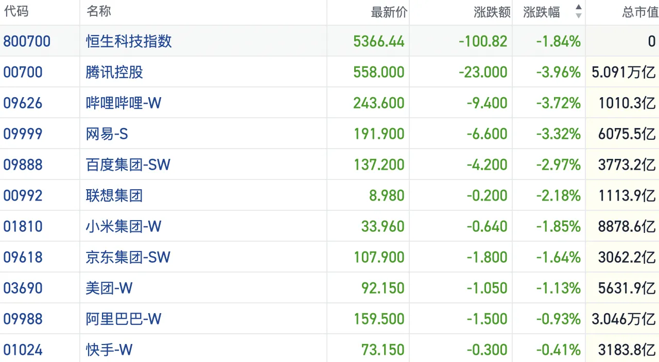 盘面上,今日大型科网股继续走弱,表现与大市脱节。腾讯跌约4%,百度跌近3%,京东、小米、美团、阿里巴巴、美团皆有跌幅。