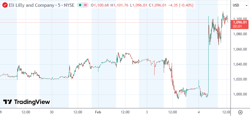 美股盘中,礼来股价逆市大幅走高,现涨超9%;诺和诺德则跌逾5%,前一交易日该股收跌12.56%。